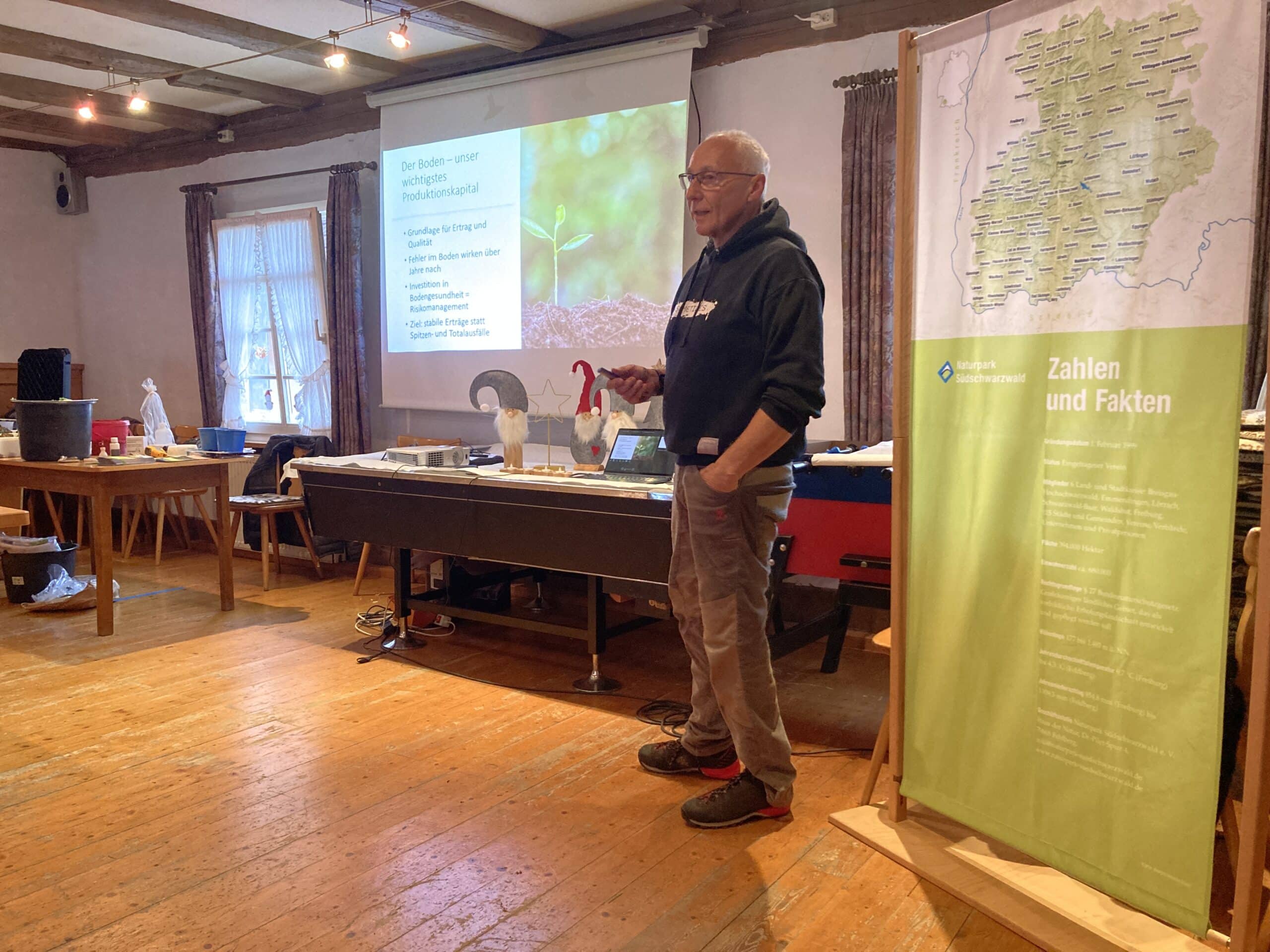 Der Bodentag des Naturparks Südschwarzwald e. V. am 13.12.25 im Gasthaus Kranz in Stühlingen-Lausheim stieß auf großes Interesse bei Landwirtinnen und Landwirten. Fachvorträge von renommierten Referenten sowie praktische Analysen von Bodenproben durch Landwirtschaftsberater Hans Koch gaben wertvolle Einblicke in die Verbesserung der Bodenfruchtbarkeit. Besonders spannend war der Vortrag von Dr. Gebhard Müller, der die EUF-Methode zur Düngeberatung anschaulich vorstellte.