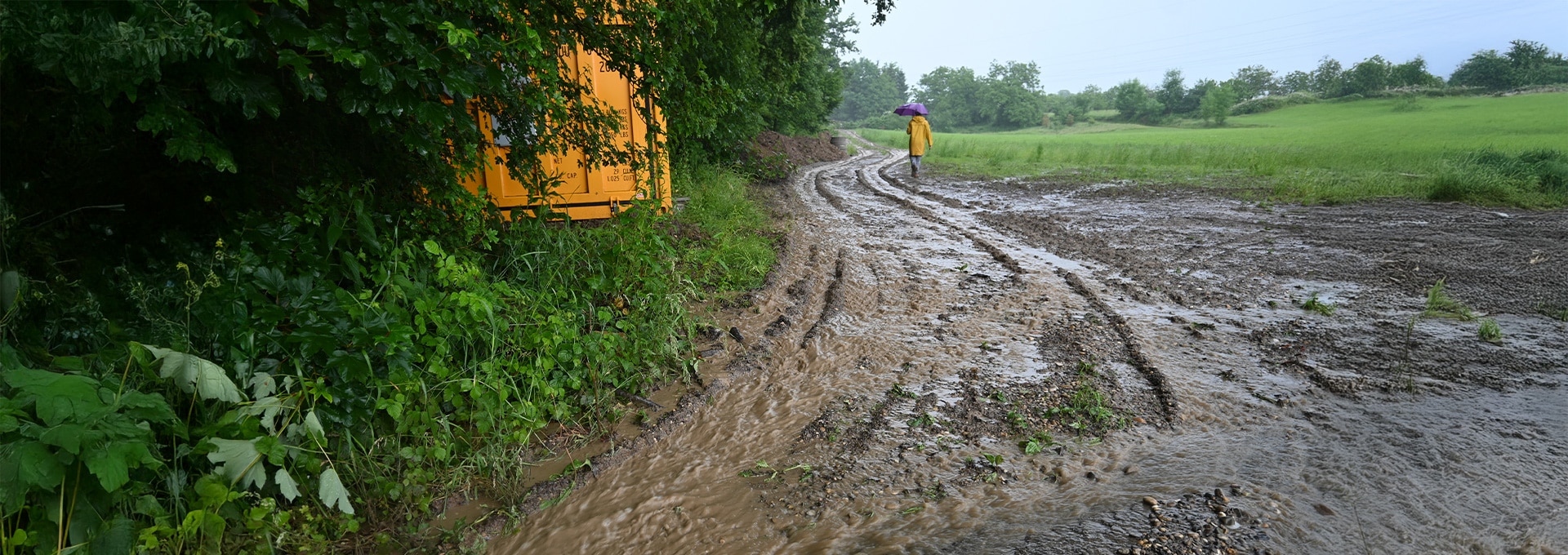 Bei Starkregen fällt in kurzer Zeit mehr Niederschlag, als vom Boden aufgenommen werden kann. Das Wasser fließt an der Oberfläche ab, folgt dem Gelände und kann dadurch erhebliche Schäden verursachen.